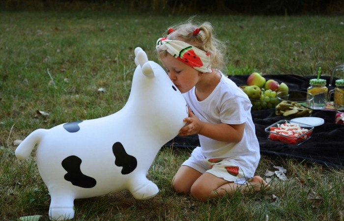 Sympatycznie rogata, łaciata krówka muuusi trafić do dzieci kochających harce na łące.